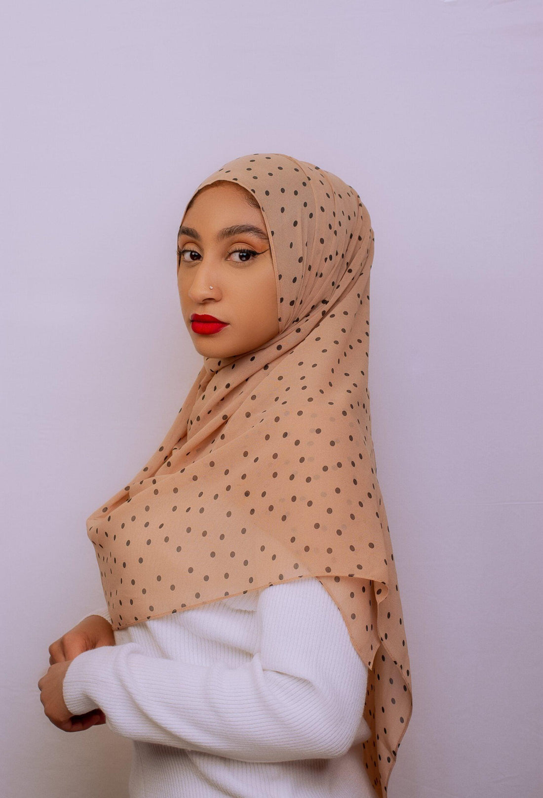 Elevate your everyday modest fashion with Nizar's Line's Day Brown Polka Dot Chiffon Hijab, an...