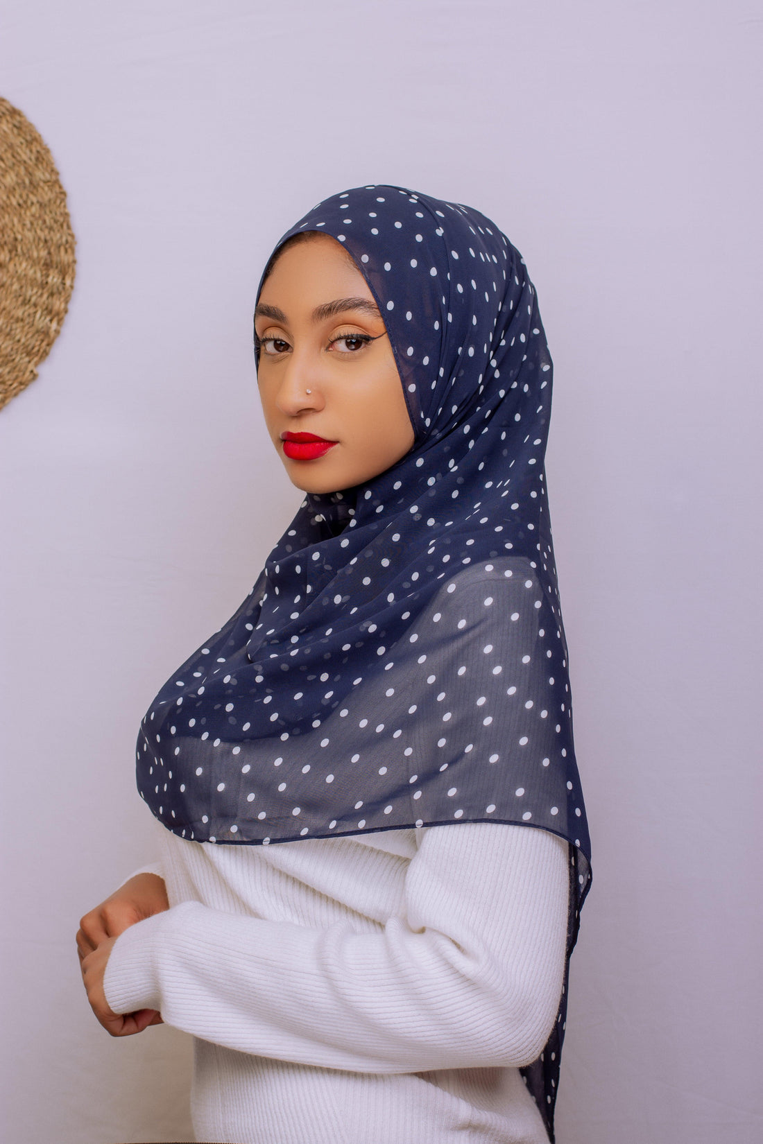 Elevate your everyday modest fashion with Nizar's Line's Navy Blue Polka Dot Chiffon Hijab,...