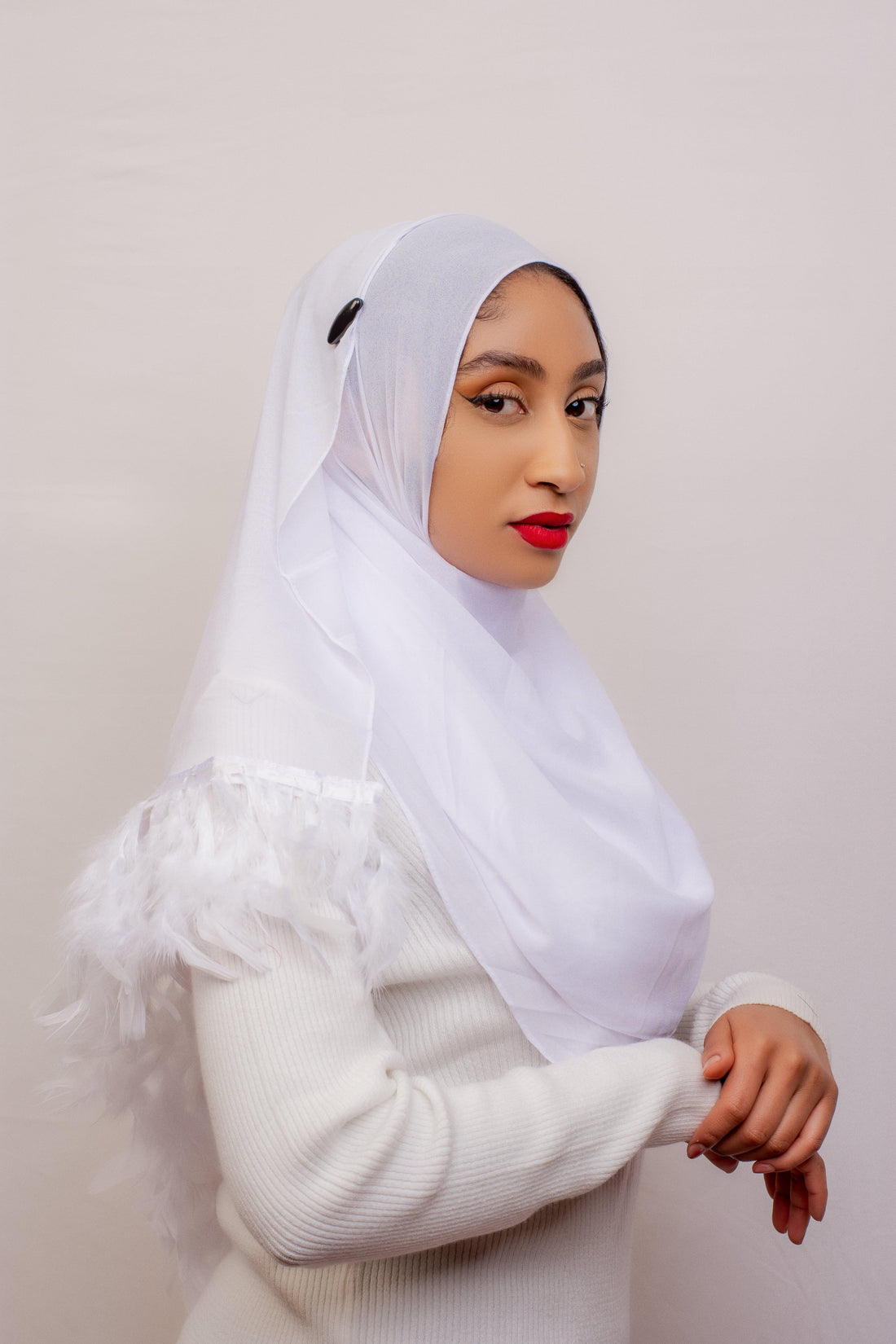 Enhance your daily modest fashion with Nizar's Line's White Feather Chiffon Hijab, a graceful addition...