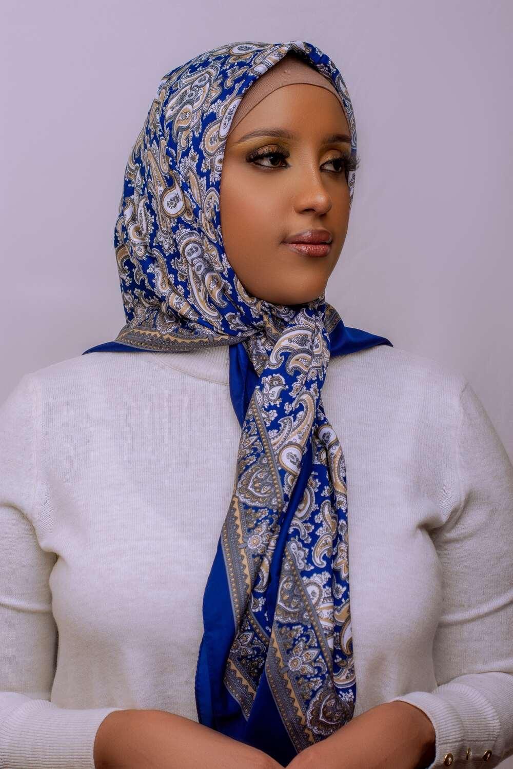 Elevate your fashion with the Blue Twill Silk Square Print Hijab from Nizar's Line's Twilli...