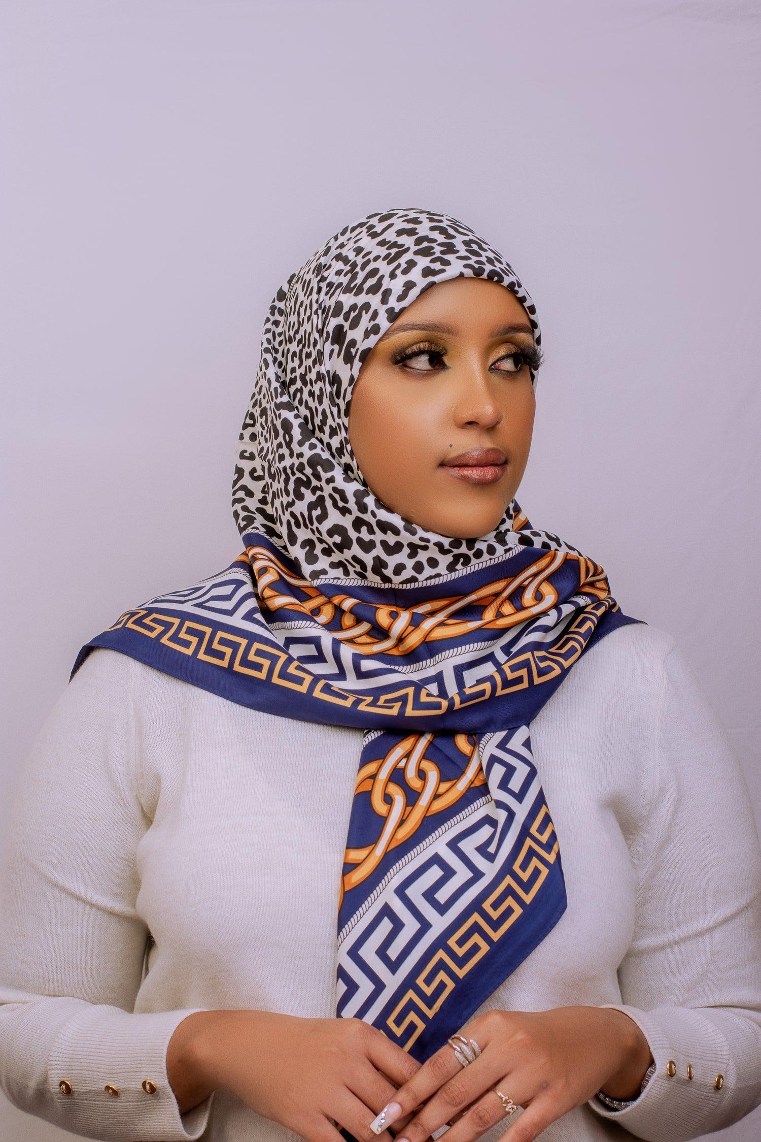 Elevate your hijab style with the Blue Leopard Print Hijab from Nizar's Line's Hijab Collection. These slightly larger silk square scarves feature a variety of prints, including the striking blue leopard print, offering a raised, vintage-inspired feel to any outfit. Crafted from luxurious 100% silk satin and measuring 110cm by 110cm, they provide exceptional quality, comfort, and versatility for endless styling possibilities. Whether for special occasions or daily wear, these scarves are a must-have addition to your wardrobe. If you're in Kenya and seeking hijabs for sale, explore Nizar's Line for quality and style that blend tradition with modern sophistication.