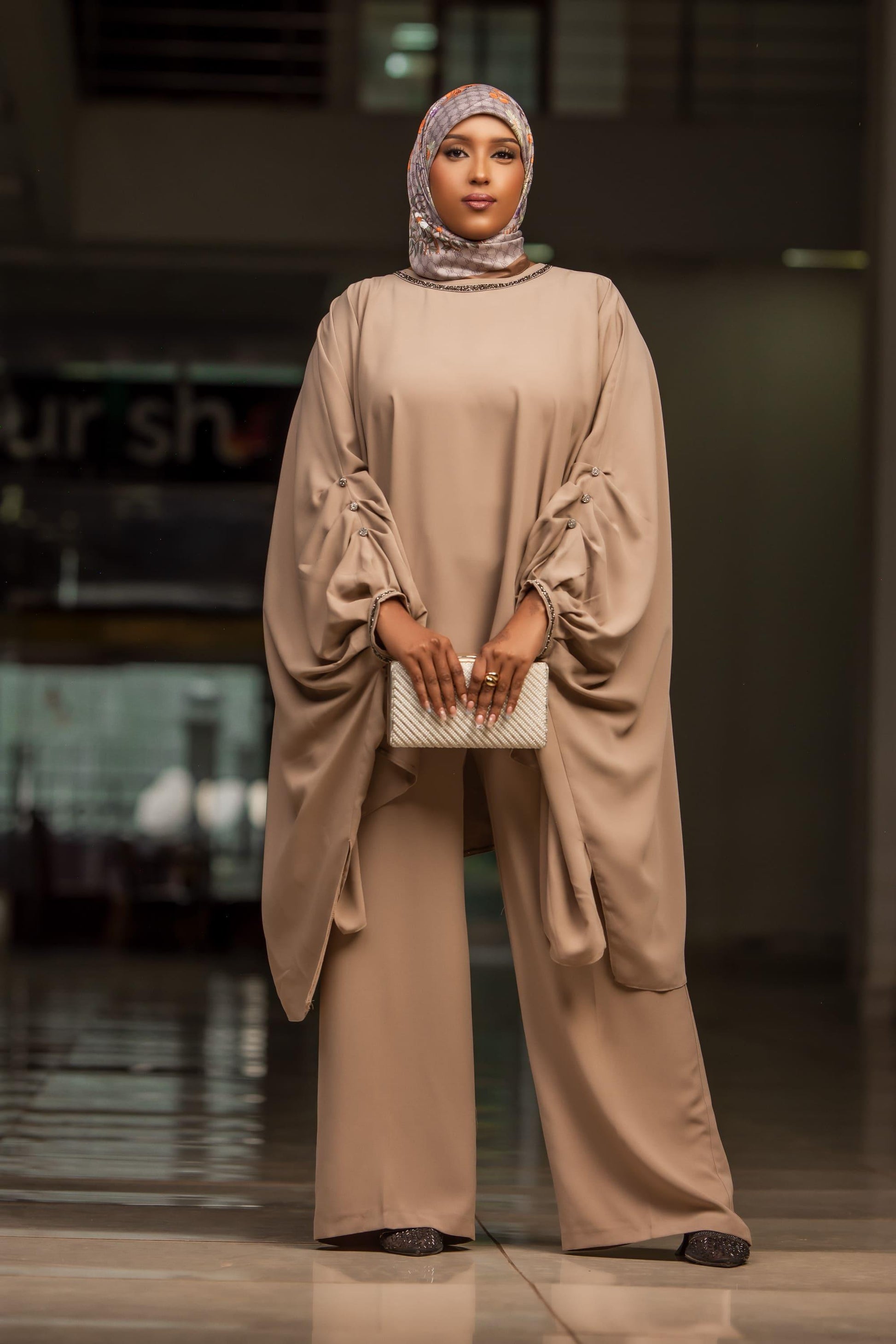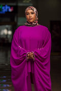 Crafted from high-quality, breathable fabric, this outfit is perfect for both formal occasions and everyday wear. The rich magenta color makes a bold statement, while the intricate detailing on the sleeves adds a touch of luxury. The ensemble is completed with a chic, patterned hijab, providing a versatile and modest look suitable for various settings.