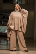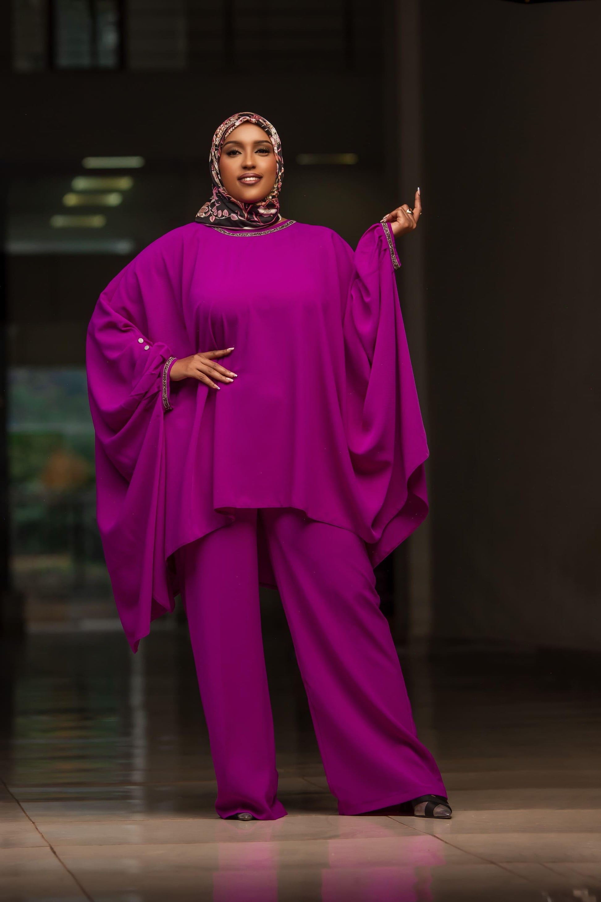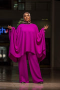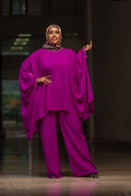 Introducing the Bold Magenta Two-Piece Set from Nizarsline's latest collection. This stunning outfit features a loose, flowing top with wide batwing sleeves that exude elegance and sophistication. The top is paired with matching wide-leg pants, creating a cohesive look that balances comfort and style.