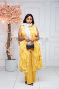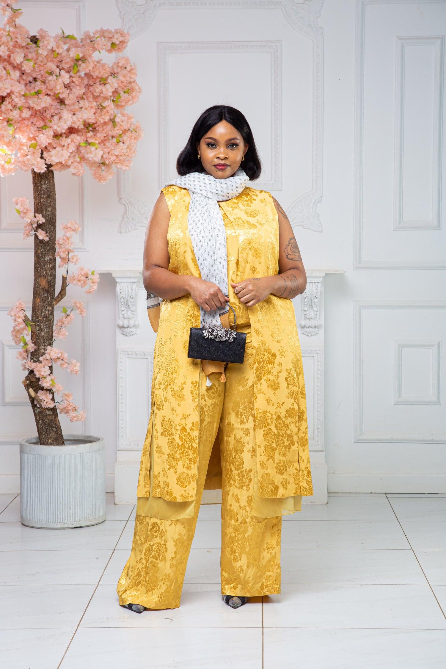 Introducing the Classy Mustard Floral 3-Piece Suit from Nizar's Line's exclusive collection. This elegant suit features a beautiful floral pattern in mustard, short sleeves for comfort, and a blend of cotton and silk for a luxurious feel. It's suitable for various occasions, combining style and quality. Elevate your fashion with this sophisticated suit, available for sale in Kenya at Nizar's Line, where quality meets affordability.