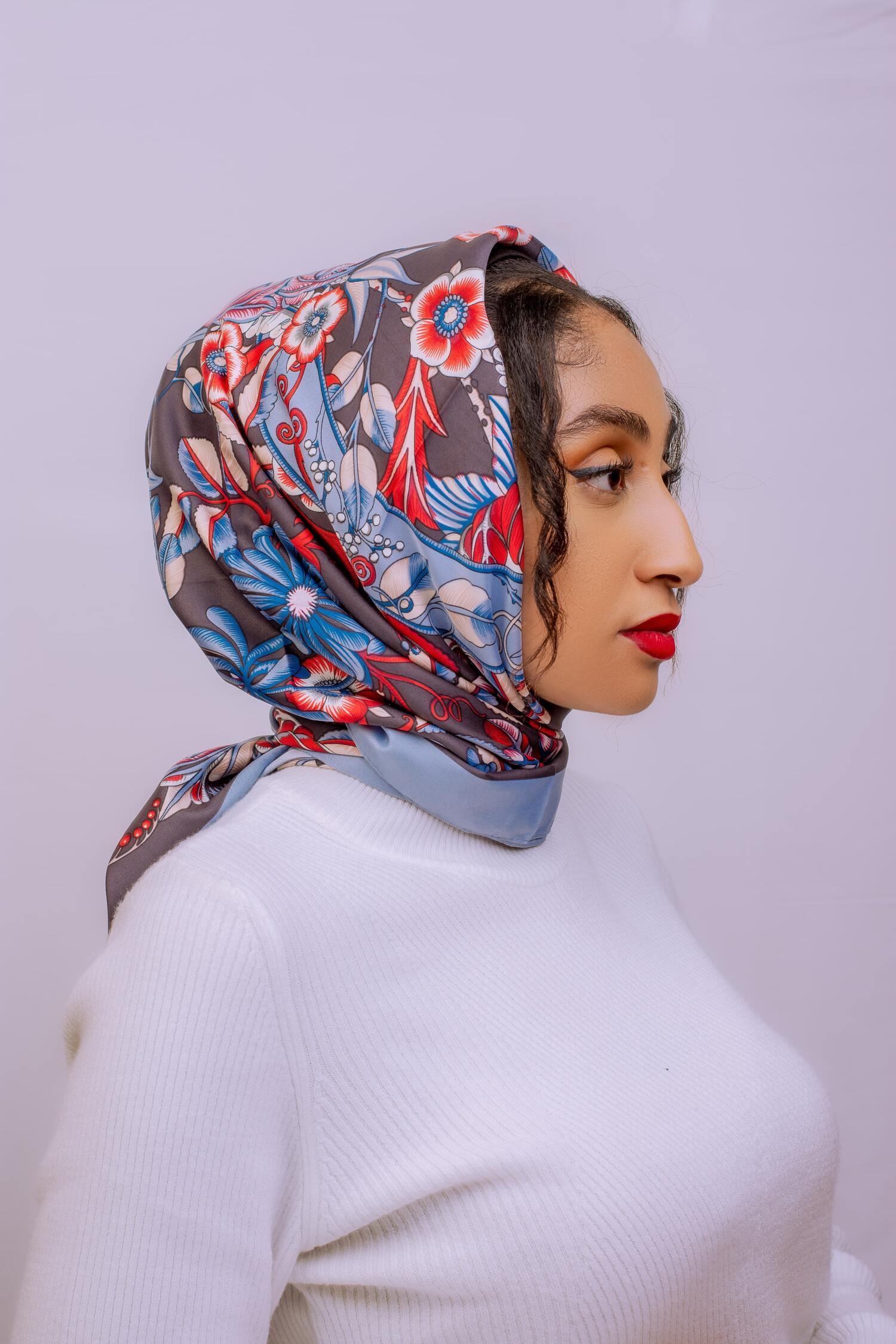 Elevate your hijab style with the Floral Blue Square Hijab from Nizar's Line's Hijab Collection. This premium silk scarf features a delicate abstract floral pattern and is crafted from 100% silk satin, offering lightweight, soft, and breathable comfort. It's not just a hijab but a versatile rectangle scarf that can also be worn as a shawl, allowing for creative styling. Whether for indoor or outdoor wear, these scarves are a four-season staple and make for great travel companions. If you're in Kenya and seeking hijabs for sale, explore Nizar's Line for quality and style that blend tradition with modern elegance. Discover the perfect hijab or shawl to enhance your wardrobe at Nizar's Line.