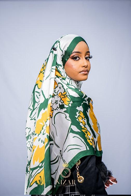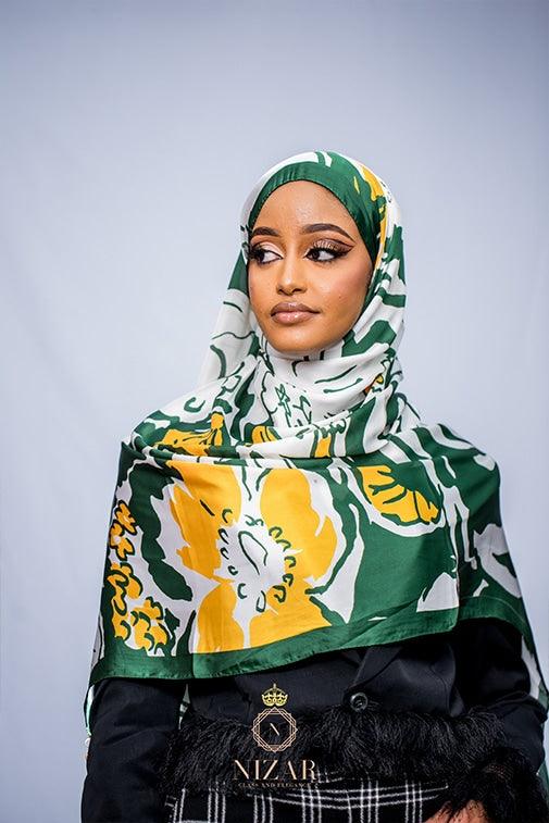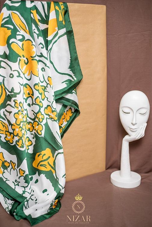 Elevate your style with the Floral Print Silk hijab from the Ghazal Hijab Collection at Nizar's Line, a luxurious accessory crafted with meticulous attention to detail. Made from 100% Silk Satin, this scarf offers a glossy finish and sophisticated knitting, ensuring a comfortable and breathable experience. Its generous dimensions of 180cm by 90cm in a versatile rectangle shape allow for various styling options, making it suitable for hijab, shawl, or creative draping. The scarf's delicate abstract floral pattern and captivating floral green color add an elegant touch to any outfit. Whether worn indoors or outdoors, this lightweight silk scarf is a four-season staple and a travel companion, reflecting superior quality and style. For those seeking high-quality hijabs for sale in Kenya, Nizar's Line is the trusted source. Don't miss out on this exquisite piece – order yours today to experience sophistication and grace in your wardrobe.