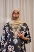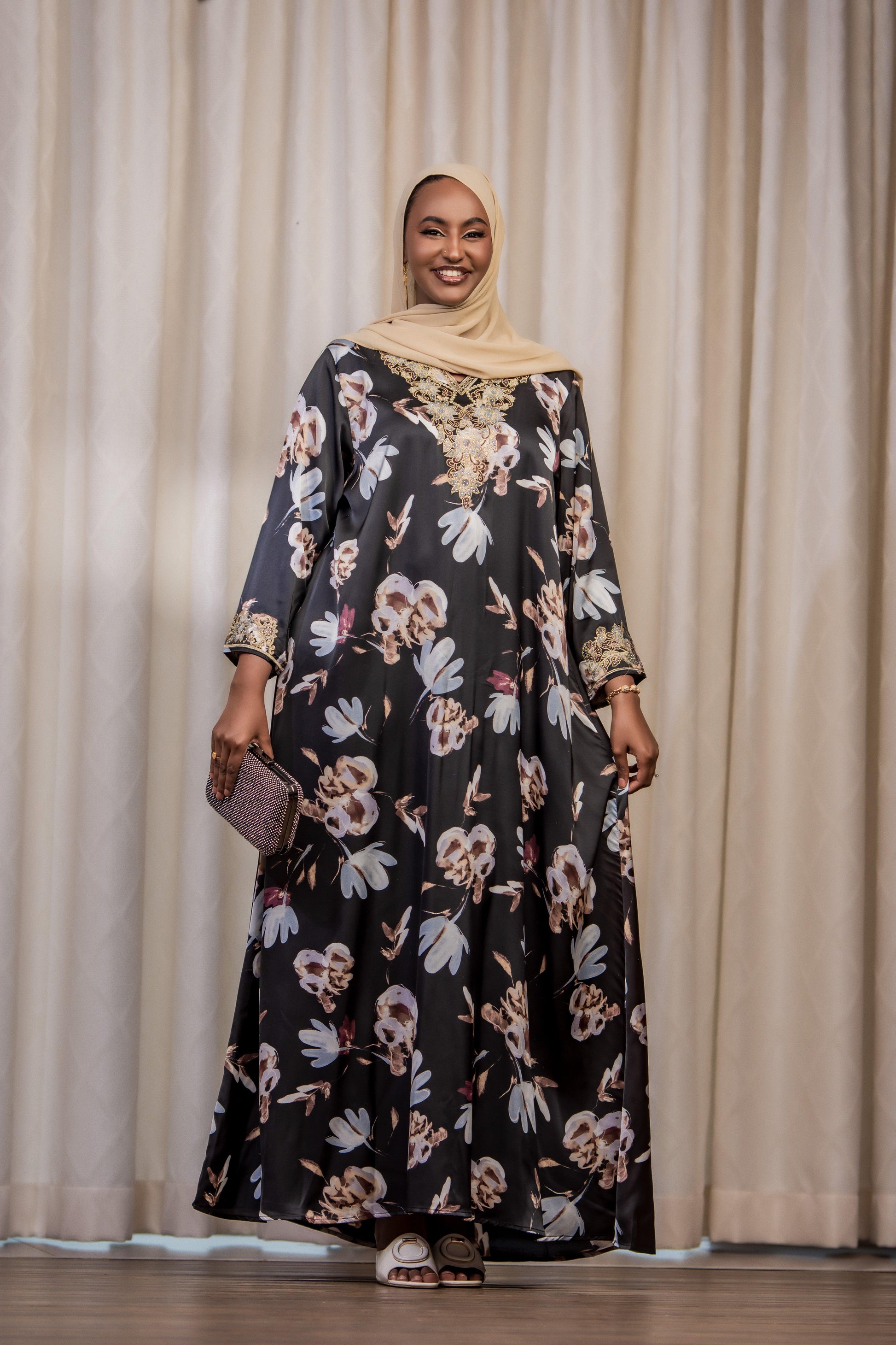 The Noor Long Dress from Nizar's Line features luxurious high-quality silk chiffon in a stunning black and gold color combination. Elegant and comfortable, this dress is perfect for both formal and semi-formal occasions. Available now at Nizar's Line for those seeking dresses for sale in Kenya.