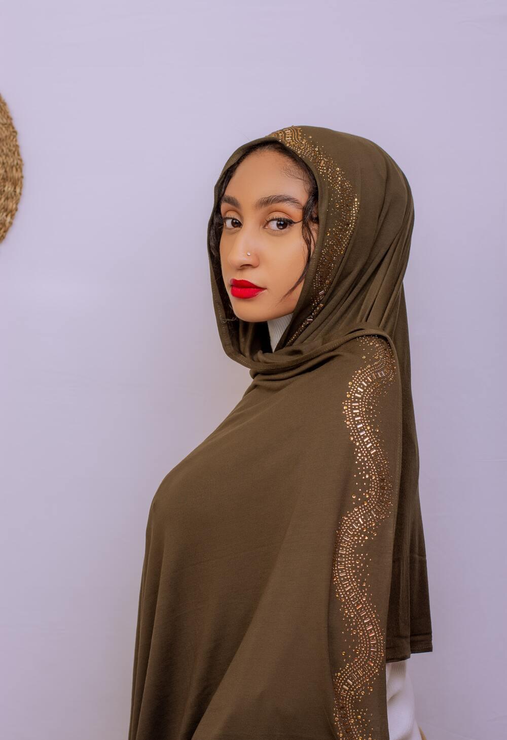 Elevate your hijab style with Nizar's Line's Olive Green Snake Jersey Hijab. Crafted from high-quality cotton jersey fabric adorned with shimmering gold stones, these hijabs offer both luxury and durability. They are versatile and suitable for various styles, from iconic looks to everyday wear. The medium-weight fabric ensures perfect draping, opacity, and long-lasting color. If you're in Kenya and looking for quality hijabs, Nizar's Line provides a blend of tradition and modern elegance. Discover the ideal hijab to enhance your wardrobe with us.