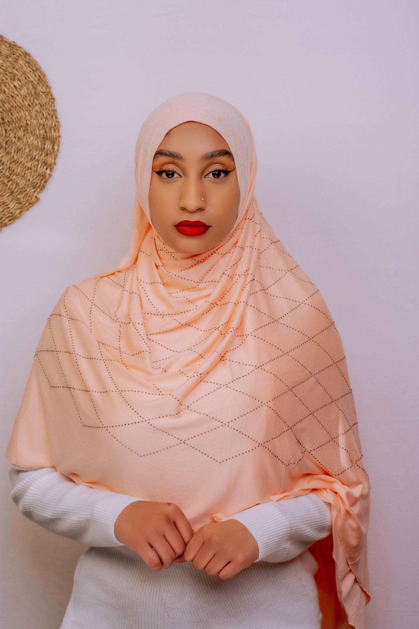 Introducing the Peach Cube Stone Jersey Hijab, a radiant addition to our collection, now available for hijab enthusiasts in Kenya at Nizar's Line. Crafted from high-quality medium-weight cotton jersey fabric, it offers unparalleled softness and comfort. Delicate shiny stones elegantly placed along its length add glamour and sophistication. With full coverage and an opaque nature, this hijab ensures confidence in modesty. Plus, its lovely peach hue remains vibrant over time, thanks to our special dyeing process. Elevate your hijab collection with the Peach Cube Stone Jersey Hijab from Nizar's Line. Order yours today, in-store or online, and experience our commitment to quality and style.