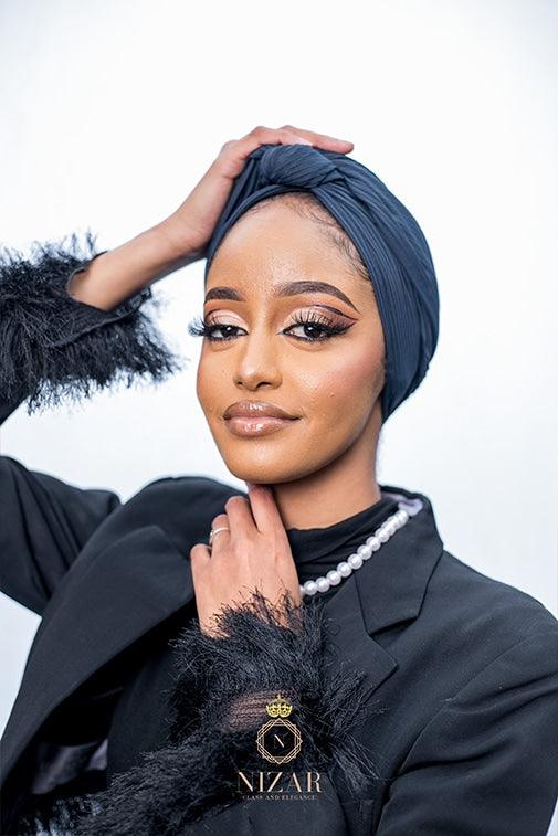 Introducing our Ribbed Turban, a versatile addition to Nizar's Line's Turban Collection in Kenya. These turbans are meticulously crafted from a high-quality blend of 95% viscose and 5% spandex, offering both the stretch of premium jersey and the luxuriousness of satin. The result is a soft, breathable, and refined accessory that adds elegance to any outfit. Suitable for various hair sizes, these turbans are designed to make you stand out effortlessly. They are perfect for experimenting with different styles and expressions, whether you're new to head wrapping, prefer modest hair covering, or simply seek quick and fashionable styling. The Navy blue color adds a vibrant touch, making them suitable for everyday wear, parties, and special occasions, providing comfort, style, and individuality to your fashion statement.