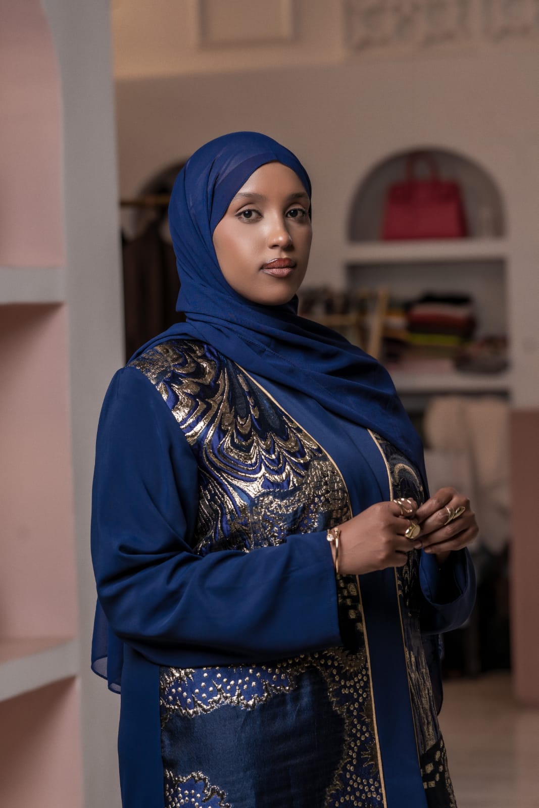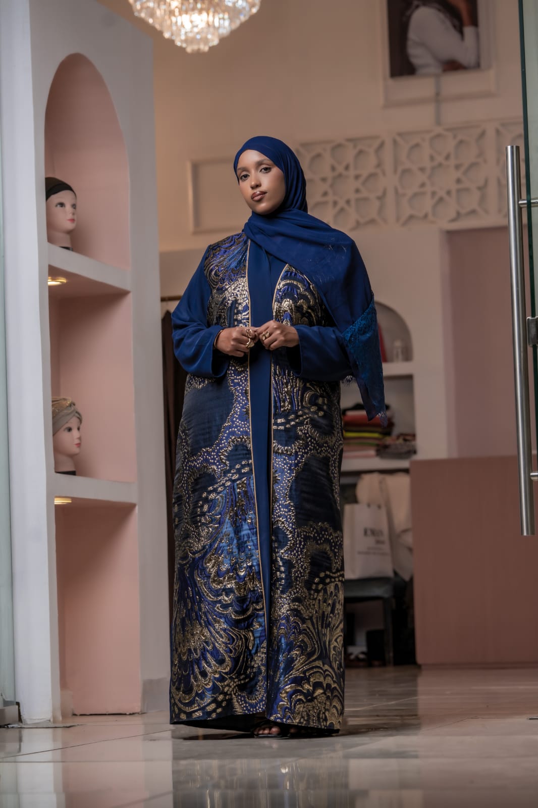 Crafted from a soft cotton and polyester blend, the Royal Abaya – Navy Blue features rich navy tones with golden accents. It’s breathable, flowy, and perfect for both everyday wear and special occasions.