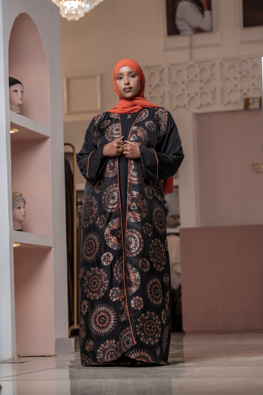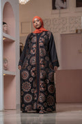 Made from a breathable cotton-polyester blend, this elegant abaya features a classic black base with vibrant orange and green highlights. Perfect for everyday wear or special occasions.