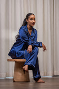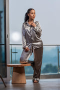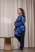 The Striped Collar Pajama from Nizar's Line is a high-quality silk set featuring an elegant striped collar, available in black, grey, and blue. Perfect for stylish relaxation, now available at Nizar's Line for those seeking pajamas for sale in Kenya