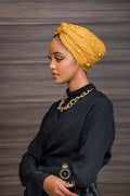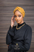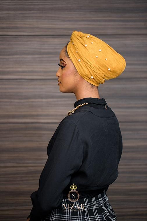 Introducing the Suede Pearled Turban, an opulent addition to our Turban Collection at Nizar's Line in Kenya. Crafted from remarkably soft and slip-resistant 100% suede material, this turban boasts flawlessly incorporated pearls that lend an element of allure, securely staying in place. Suitable for various hair sizes and occasions, it exudes sophistication, whether for office wear or special events. Its user-friendly design requires no pins; simply give it a twist and wrap it around for an effortlessly chic appearance. Turbans offer a versatile fashion statement, catering to those exploring head wrapping or seeking a modest, stylish accessory. With its mustard hue, it adds a feminine touch, making it adaptable for daily wear, festive gatherings, and special occasions, ultimately serving as an emblem of personal style and elegance.