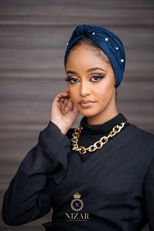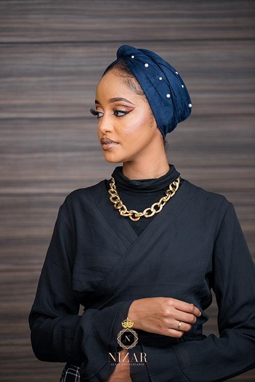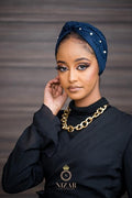 Introducing the Suede Pearled Turban, an opulent addition to our Turban Collection at Nizar's Line in Kenya. Crafted from remarkably soft and slip-resistant 100% suede material, this turban boasts flawlessly incorporated pearls that lend an element of allure, securely staying in place. Suitable for various hair sizes and occasions, it exudes sophistication, whether for office wear or special events. Its user-friendly design requires no pins; simply give it a twist and wrap it around for an effortlessly chic appearance. Turbans offer a versatile fashion statement, catering to those exploring head wrapping or seeking a modest, stylish accessory. With its navy blue hue, it adds a feminine touch, making it adaptable for daily wear, festive gatherings, and special occasions, ultimately serving as an emblem of personal style and elegance.