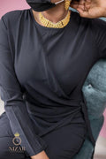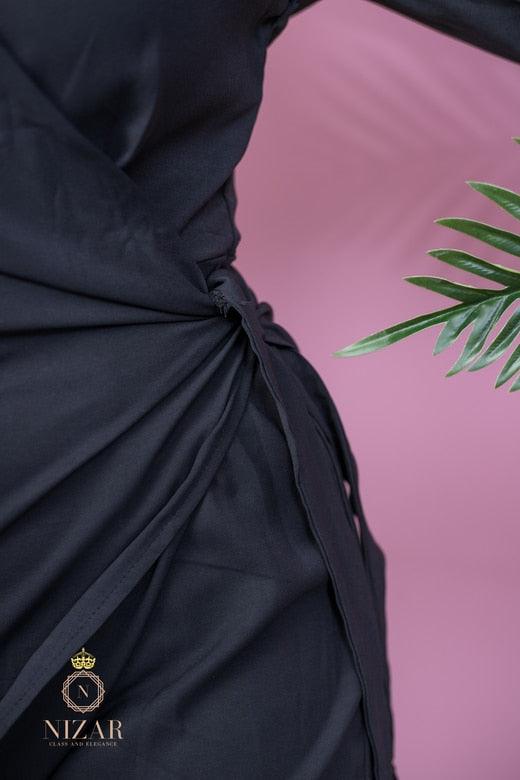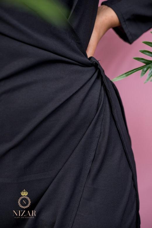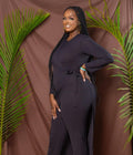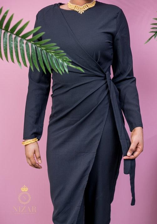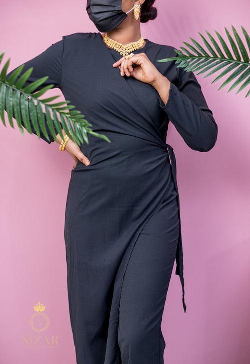 Elevate your style with our Black Wrap-On Jumpsuit, a chic addition to Nizar's Line's Wrap-On Jumpsuit Collection. This elegant piece features a wrap-waisted design and a modest round neckline suitable for everyone. Its non-stretch, high-quality fabric ensures durability and comfort, and the cleverly concealed back zip adds a stunning touch. The long pants can be customized to your desired length. Whether you're petite or tall, this jumpsuit fits perfectly. Trust Nizar's Line for top-quality jumpsuits in Kenya. Order the Black Wrap-On Jumpsuit today and experience the difference!